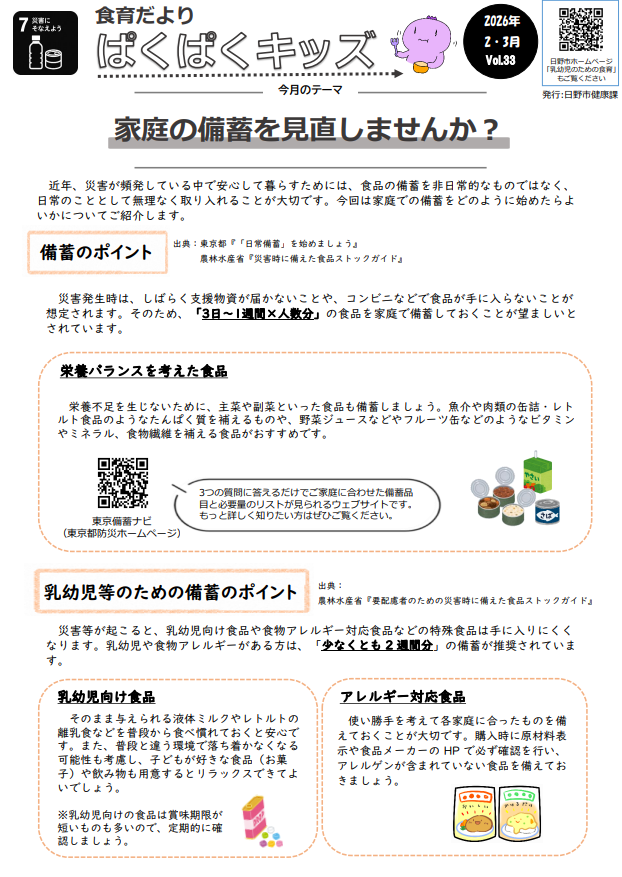 食育だより ぱくぱくキッズ2・3月号(vol.33)を発行しました 2026年02月01日 食育だより ぱくぱくキッズ2・3月号(vol.33)を発行しました。今回のテーマは「家庭の備蓄を見直しませんか?」です。ぜひご覧ください。