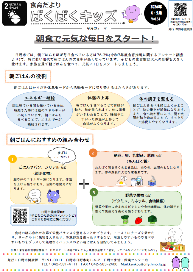 食育だより ぱくぱくキッズ4・5月号(vol.34)を発行しました 2026年04月01日 食育だより ぱくぱくキッズ4・5月号(vol.34)を発行しました。今回のテーマは「朝食で元気な毎日をスタート!」です。ぜひご覧ください。
