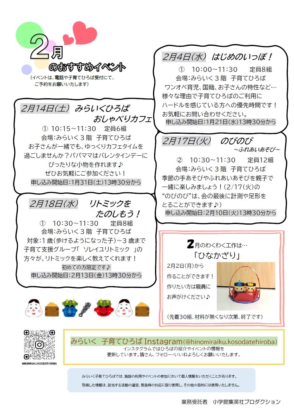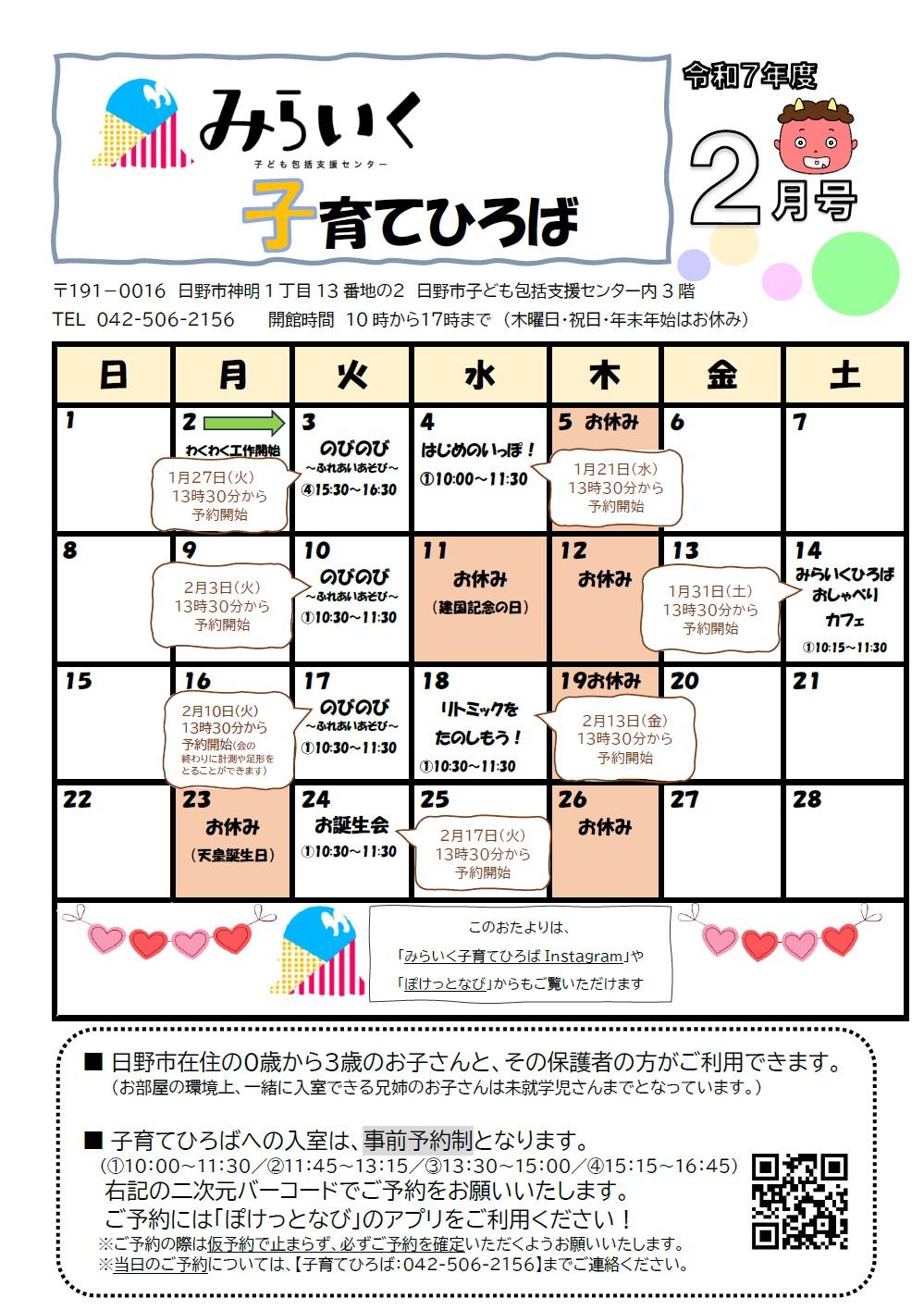 みらいく子育てひろばだより2月号をアップしました 2026年01月22日 子ども包括支援センターみらいく3階の子育てひろばのイベント情報です。みらいく子育てひろばの利用方法●問い合わせ子ども包括支援センターみらいく子育てひろば042-506-2156